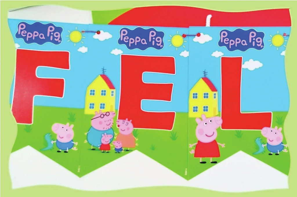 Banderín Feliz Cumple Peppa Pig, mide 2 metros de largo aprox. Hecho en papel. Ideal para decorar tu cumple de la cerdita mas famosa!