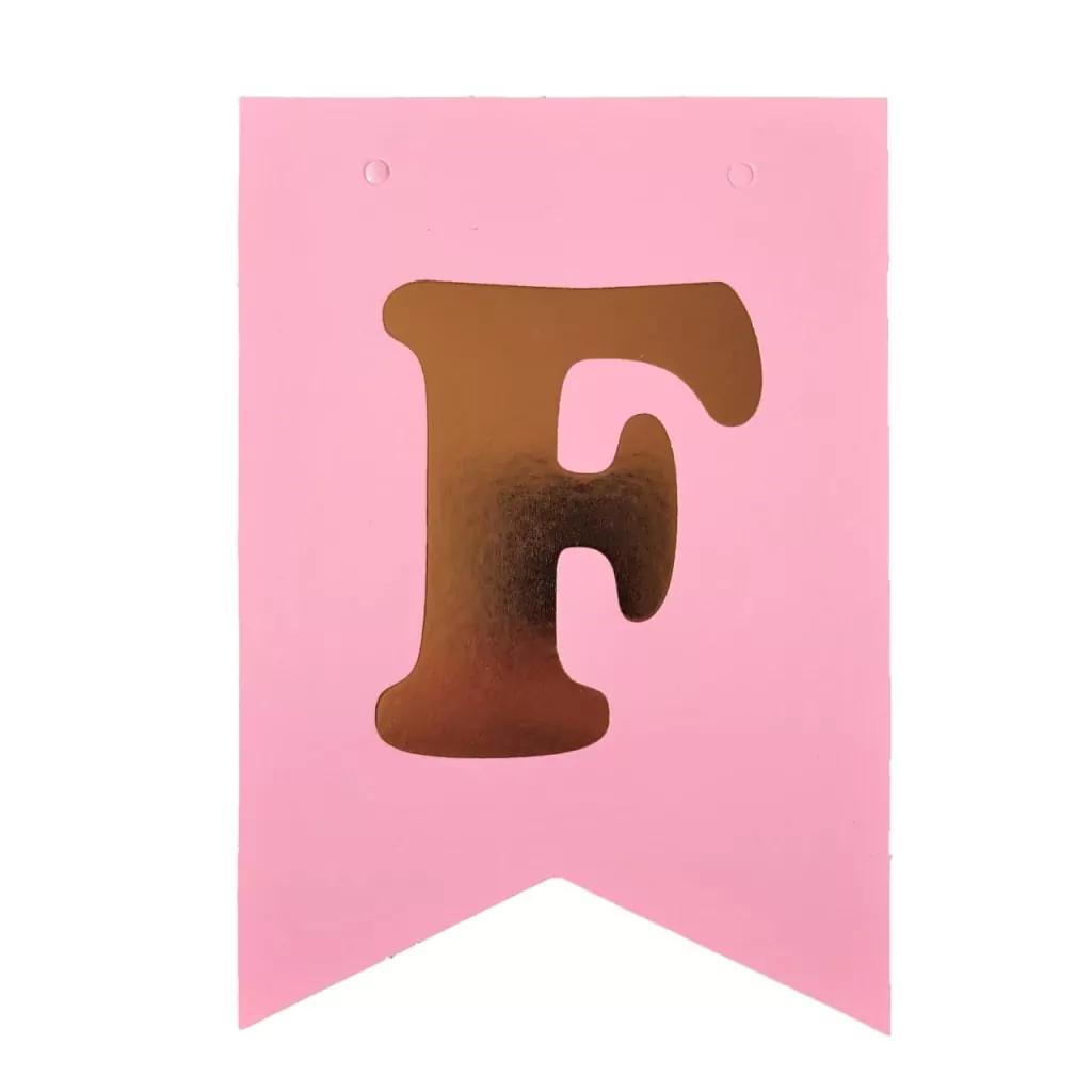 Banderin Feliz Cumlpeaños Rosa Pastel con letras stamping doradas.